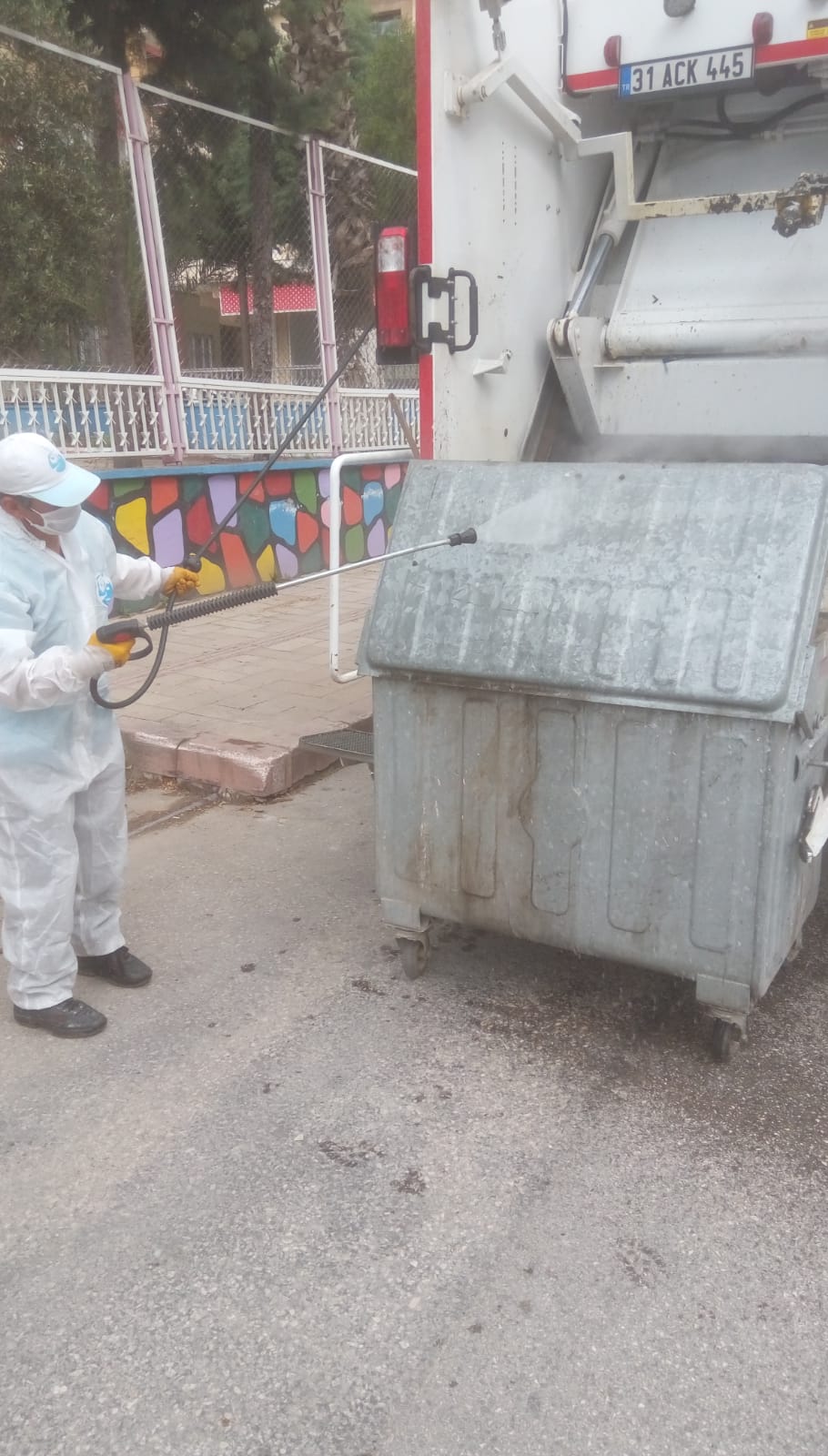 Antakya Belediyesi ekipleri, Koronavirüs tedbirleri kapsamında şehir genelindeki konteynerlerde yıkama ve dezenfekte çalışması gerçekleştiriyor.
