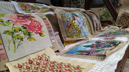 ÇOCUKLUĞUNDA ANNESİNDEN ÖĞRENDİĞİ GOBLEN SANATINI GÜNÜMÜZE KADAR HÂLÂ SÜRDÜREN BELKIS ANLAR YORULMAZ, HOBİ OLARAK YAPTIĞI BU SANATTAN ÇIKAN ÜRÜNLERİ TANIDIKLARINA VE SEVDİKLERİNE HEDİYE OLARAK VERİYOR. (DOĞANAY YİĞİT/HATAY-İHA)
