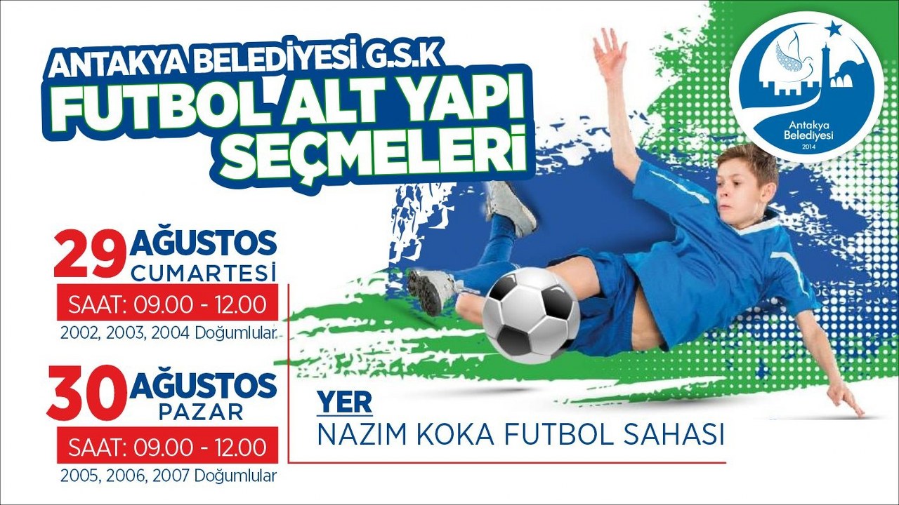 Antakya Belediyesi’nden konuyla ilgili yapılan açıklamada şunlar yer aldı; “Antakya Belediyesi Gençlik Spor Kulübü Futbol alt yapı seçmeleri başlıyor. 2020 – 2021 sezonu alt yapı takımları için yapılacak seçmeler 29 – 30 Ağustos tarihlerinde Nazım Koka Futbol Sahası’nda gerçekleştirilecek. 2002 – 2003 – 2004 doğumlu olan gençlerimiz 29 Ağustos tarihinde 09.00 – 12.00 saatleri arasında, 2005 – 2006 – 2007 doğumlu olan gençlerimiz ise 30 Ağustos tarihinde yine 09.00 – 12.00 saatleri arasında gerçekleştirilecek olan seçmelere katılabilecekler.