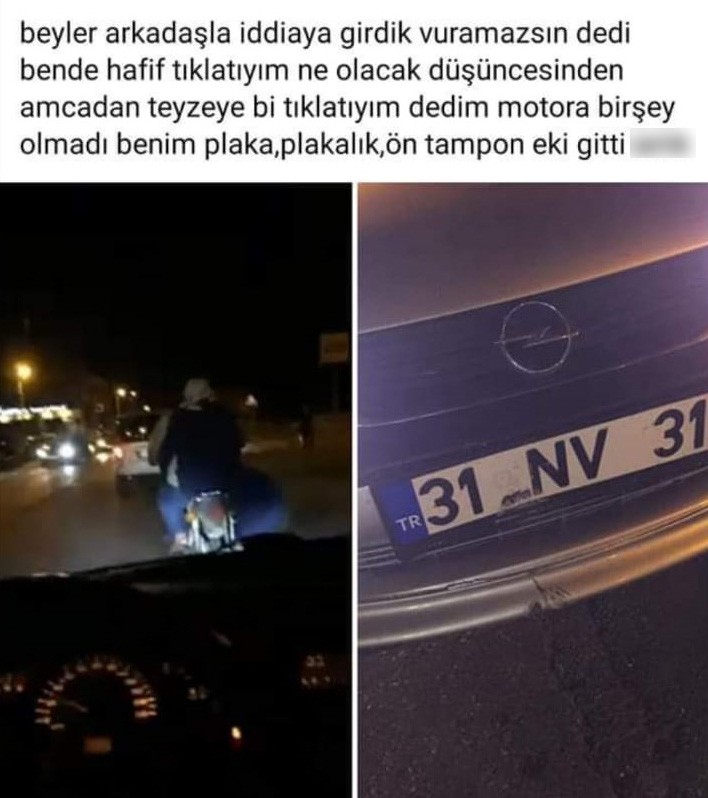 Olay, Antakya ilçesinde meydana geldi. Alınan bilgiye göre, Mehmet Kafadar Caddesi Eski Hastane mevkiinde akşam saatlerinde Kahraman B. isimli şahıs, bir arkadaşıyla girdiği iddia üzerine otomobilini yaşlı bir çiftin bulunduğu motosikletin üzerine sürdü. Çarpmanın şiddetiyle motosikletleriyle beraber yere düşen yaşlı karı-koca hafif yaralandı. Yaşanan olay sırasında aynı zamanda görüntü kaydı yapan Kahraman B., kazayı sosyal medya hesabından paylaştı. Kısa sürede büyük tepki çeken görüntüler sonrası harekete geçen Hatay İl Emniyet Müdürlüğüne bağlı Şehit Özen Polis Merkezi Amirliği ve Trafik Denetleme Şube Müdürlüğü ekipleri, Kahraman B.’yi yakalayarak gözaltına aldı. Şahsa “trafiği tehlikeye atmak, yakın takip kuralına uymamak, trafik güvenliği yükümlülüğüne uymamak” suçlarından 396 TL para cezası uygulanırken, 31 NV 311 plakalı otomobili de trafikten men edildi. Şahsın işlemlerinin tamamlanmasının ardından adliyeye sevk edileceği bildirildi.
