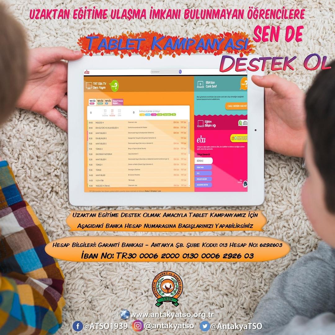 Antakya Ticaret ve Sanayi Odası, koronavirüs döneminde öğrencilerin eğitime daha kolay ulaşabilmesi adına üyelerine yönelik bir kampanya duyurusu yaptı. Üyelere yönelik yapılan duyuruda ATSO üyelerinden kampanyaya destek istendi. ATSO tarafından yapılan duyuruda, “Eğitime sağladığımız her destek, geleceğimizi yeşerten bir tohumdur. Ülkemizin teminatı ve umudu çocuklarımızı en iyi şartlarda geleceğe taşımak hepimizin görevidir. Antakya Ticaret ve Sanayi Odası olarak eğitime desteklerimizi sürdürüyor, onların eğitim süreçlerinde yanlarında oluyoruz. İçerisinde bulunduğumuz süreç dolayısıyla çocuklarımız bu yıl eğitim-öğretim yılına farklı bir başlangıç yaptılar. Bizler de; “Uzaktan Eğitim” dediğimiz kavram ile karşı karşıya kaldığımız bu dönemde, erişim imkanı bulamayan çocuklarımızın önemli bir eksikliği olan tablet ihtiyacını karşılama düşüncesiyle “Bir Tablet de Senden” kampanyamızı başlattık. Siz Değerli Üyelerimizin desteğini yakından hissedeceğimize olan sonsuz inancımızla, hep birlikte el ele vererek daha çok çocuğumuza erişim imkanı sağlayacağımızı biliyoruz. Yapacağınız bağışlarla daha fazla sayıda tableti daha fazla öğrencimize ulaştıracak, onlara önemli bir katkı sağlamış olacağız. Geleceğin en iyi bilim insanlarının, mühendislerinin, sanatçılarının, özetle; eğitimli insan kaynağının yetiştirilmesi için bir adım da sizden olsun! Tüm üyelerimizi uzaktan eğitime erişim imkanı bulamayan öğrencilerimize destek olmaya davet ediyor, sağlıklı günler diliyoruz. Kampanyamıza destek olmak için lütfen tıklayınız. http://antakyatso.org.tr/egitime-tablet.php” denildi.