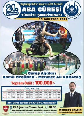 Aba güreşlerinin anavatanı olan Yayladağı’nda güreş ağaları Kamil Ergüder ve M. Ali Karataş’ın katkılarıyla Türkiye Geleneksel Güreşler Federasyonu’na bağlı “Aba Güreşi Türkiye Şampiyonası” Devrent Sosyal Tesisleri Mustafa Sayın Aba Güreşi Alanında yapılacak. 13 Ağustos Cumartesi günü saat 10.00’da başlayacak turnuva heyecan fırtınası şeklinde geçecek.