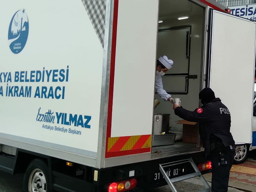 Antakya Belediye Başkanı İzzettin Yılmaz’ın talimatları doğrultusunda Antakya Belediyesi ekipleri, hafta sonu sokağa çıkma yasağında Polis ve Jandarma kontrol noktalarına çorba, çay ve tatlı ikramı ulaştırdılar.