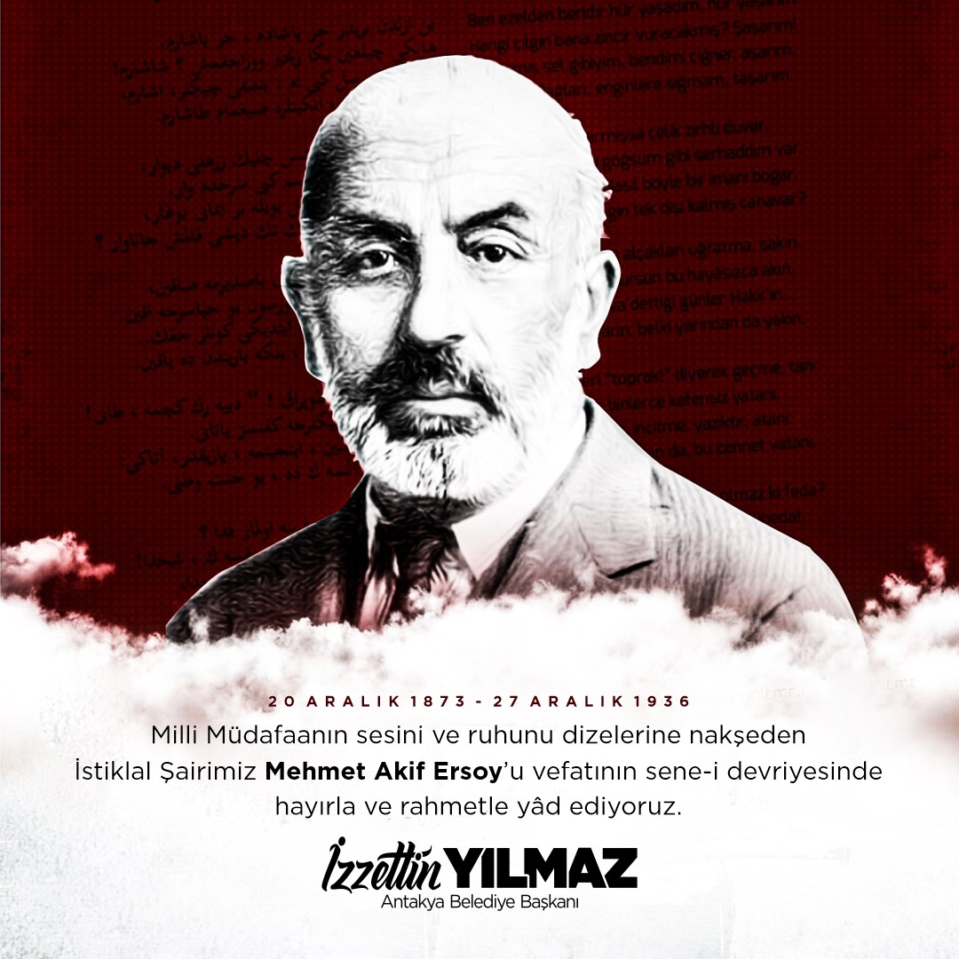 Antakya Belediye Başkanı İzzettin Yılmaz 20 – 27 Aralık Mehmet Akif Ersoy’u anma haftası ve milli şairin vefatının 84. yıldönümü münasebeti ile bir mesaj yayınladı.