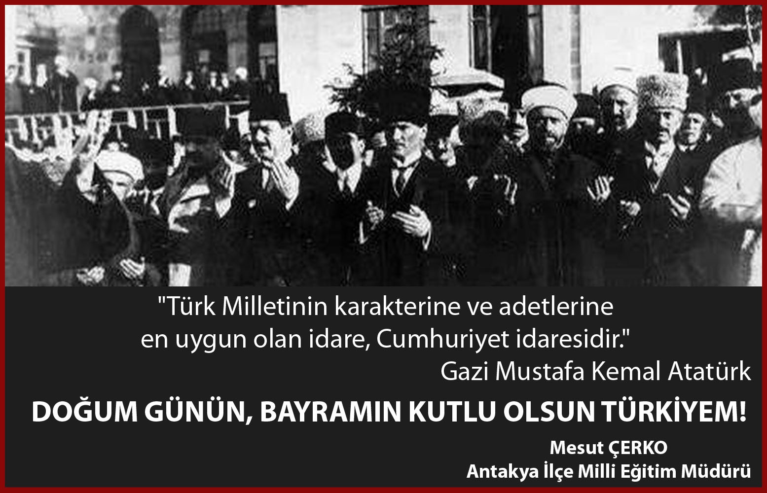 Antakya İlçe Milli Eğitim Müdürü Mesut Çerko 29 Ekim Cumhuriyet Bayramı dolayısıyla mesaj yayınladı.