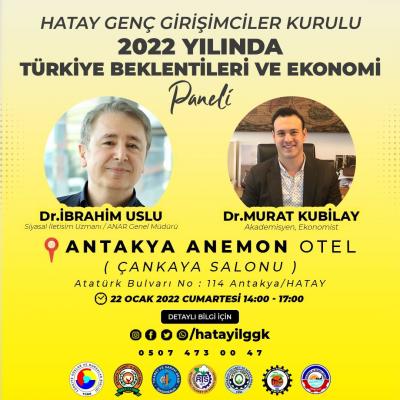 Antakya Anemon Otel’de gerçekleşecek olan panelde Türkiye’nin Önde Gelen Siyaset İletişim Uzmanı – Eski Anar Genel Müdürü Dr. İbrahim Uslu ve Akademisyen – Ekonomist Dr. Murat Kubilay “ sunum yapacak. 2022 Yılında Türkiye Beklentileri ve Ekonomi”nin“ değerlendireceği panele tüm vatandaşlar davet edildi. Hatay Genç Girişimciler Kurulu Başkanı Ali Dablan, yaptığı açıklamada; “Hatay Genç Girişimciler Kurulu olarak 22.01.2022 Cumartesi günü saat 14:00’da Antakya Anemon Otel’de Türkiye’nin Önde Gelen Siyaset İletişim Uzmanı – Eski Anar Genel Müdürü Dr. İbrahim Uslu ve Akademisyen – Ekonomist Dr. Murat Kubilay’ın“ sunumlarıyla “2022 Yılında Türkiye Beklentileri ve Ekonomi”nin“ değerlendireceği panelimize tüm İş dünyasını davet ediyoruz” dedi.