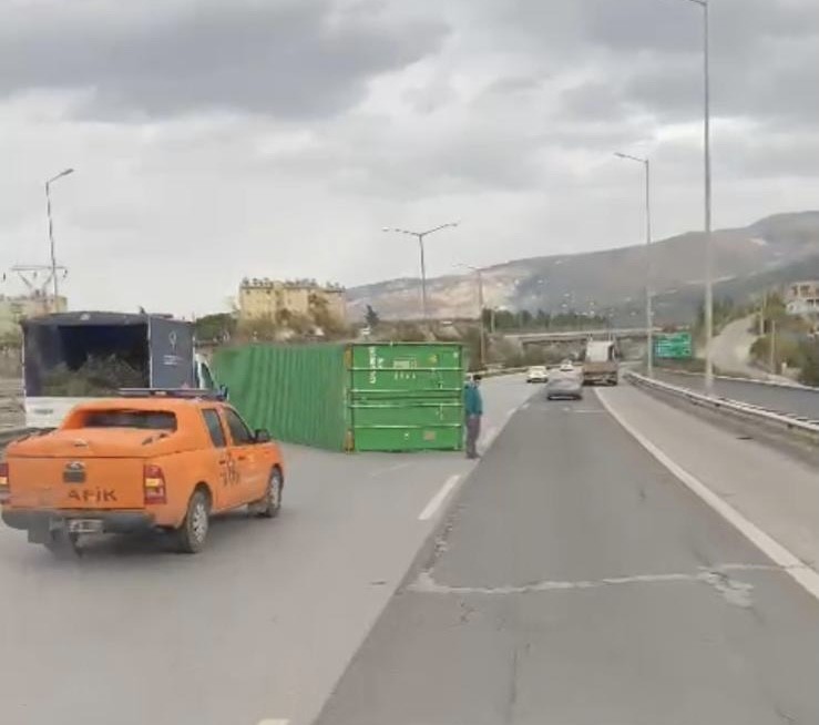 İskenderun Körfezinin turkuaz renge büründüğü fırtınada liman çevresinde boş arazide üst üste bekletilen boş konteynerler devrilirken İskenderun-Adana otoyolunda ise İskenderun’dan Payas yönüne giden tırda yüklü konteynerler de rüzgar nedeniyle devrildi.