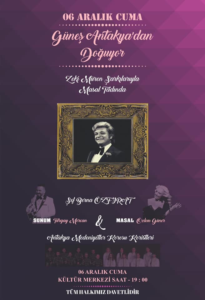 Sanat Güneşi’ Zeki Müren ölümünün 23’üncü yılında  Antakya Kültür Merkezinde masal tadında bir gecede anılacak.Zeki Müren’nin doğduğu gün olan 6 Aralık günü gerçekleşecek olan ” Güneş Antakya’dan doğuyor ” programında Antakya Medeniyetler Korosu koristleri şef Berna Torun Özfırat yönetiminde ilk kez Zeki Müren Şarkılarını seslendirecek.