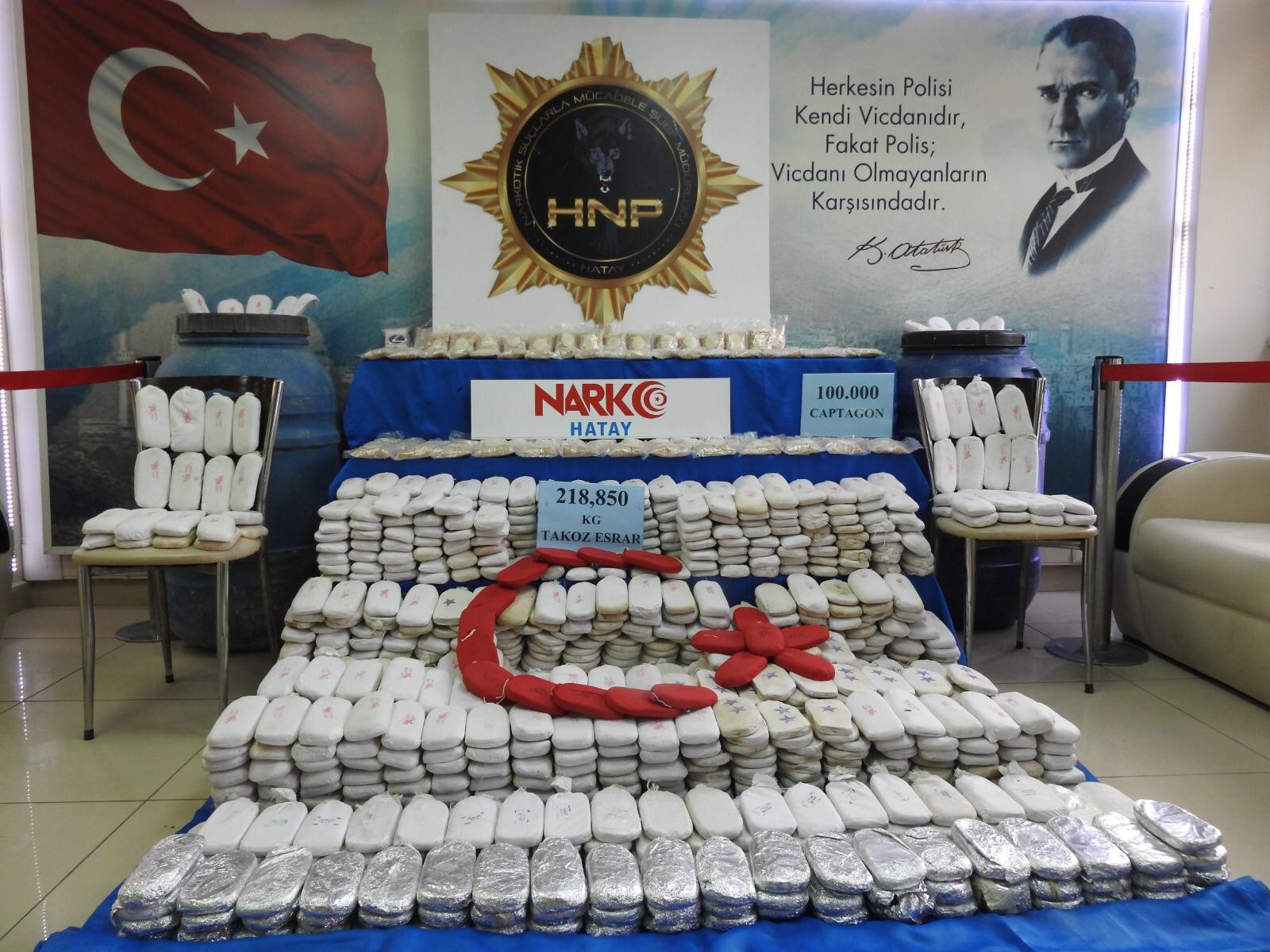 Alınan bilgiye göre, Hatay İl Emniyet Müdürlüğü Narkotik Suçlarla Mücadele Şube Müdürlüğü ekipleri, İstihbarat Şube Müdürlüğü ile koordineli olarak Reyhanlı ilçesine bağlı Varışlı Mahallesi’nde operasyon düzenlendi. Operasyonda 218 kilo 850 gram takoz esrar, 100 bin adet Captagon hap ele geçirildi.