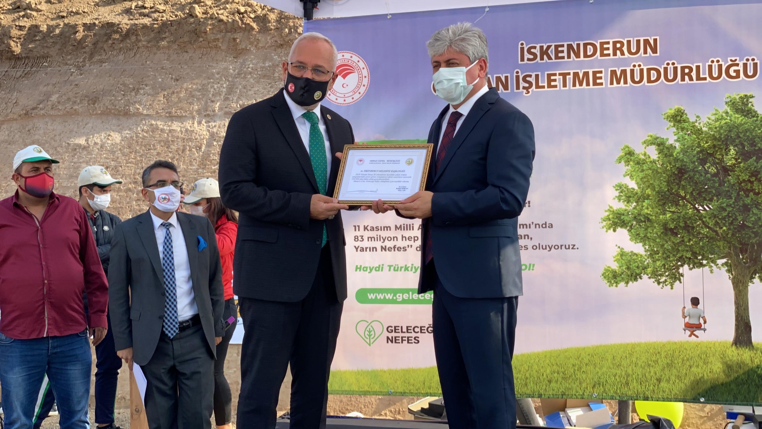 Konuşmaların ardından Vali Doğan her bir İskenderunlu için olmak üzere toplam 250 bin fidan bağışında bulunan İskenderun Belediye Başkanı Fatih Tosyalı ve Türkiye Gençlik Vakfı (TÜGVA) Genel Başkanı Enes Eminoğlu başta olmak üzere fidan bağışında bulunanlara teşekkür belgesi takdim edildi.