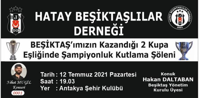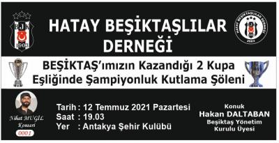 Hatay Beşiktaşlılar Derneği organizasyonunda gerçekleşecek olan kutlama şöleni Süper Lig şampiyonluk Kupası ve Ziraat Türkiye Kupası eşliğinde gerçekleşecek. Beşiktaş J.K.Yönetim Kurulu Üyesi Hemşerimiz Hakan Daltaban’ın da katılacağı Şampiyonluk kutlama şöleni Antakya şehir kulübünde 12 Temmuz 2021 Pazartesi günü saat : 19:03’te başlayacak. Şampiyonluk kutlama şöleni biletleri Antakya ve İskenderun Kartal Yuvası Mağazalarından temin edilebilecek.Hatay’lı sanatçı Nihat Mugil’in sahne alacağı programın yoğun ilgi görmesi bekleniyor.