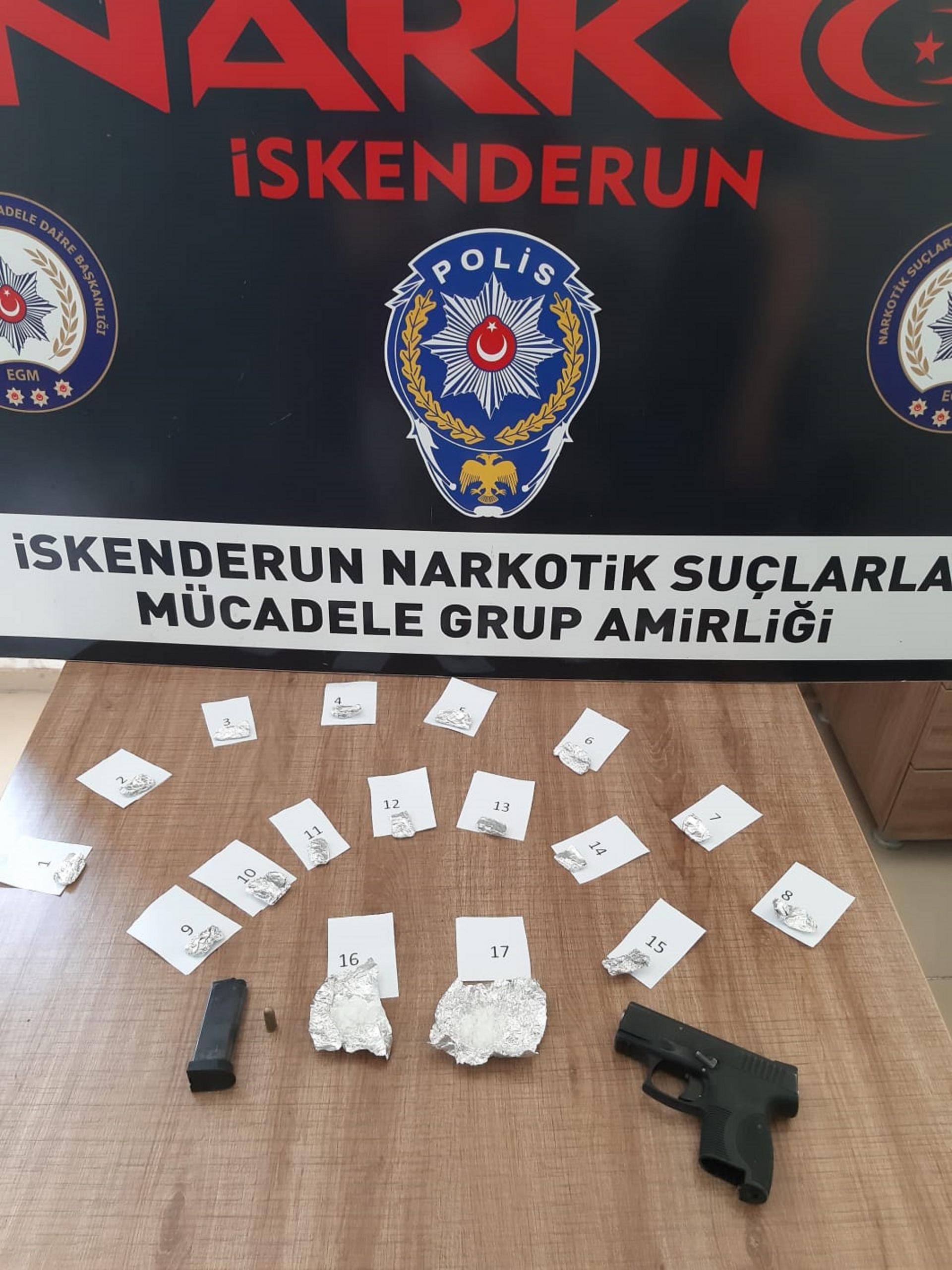 H.İ.Ö. İSİMLİ ŞAHSIN YILDIRIMTEPE MAHALLESİNDEKİ İKAMETİNDE YAPILAN ARAMADA 17 ADET FİŞEK HALİNDE ALÜMİNYUM FOLYOYA SARILI SATIMA HAZIR HALDE DARALI AĞIRLIĞI 15 GRAM METAMFETAMİN MADDESİ, 1 ADET TABANCA VE BU TABAYA AİT İÇERİSİNDE 1 ADET FİŞEK BULUNAN ŞARJÖR ELE GEÇİRİLDİ. (NECATİ İVGİN/HATAY-İHA)