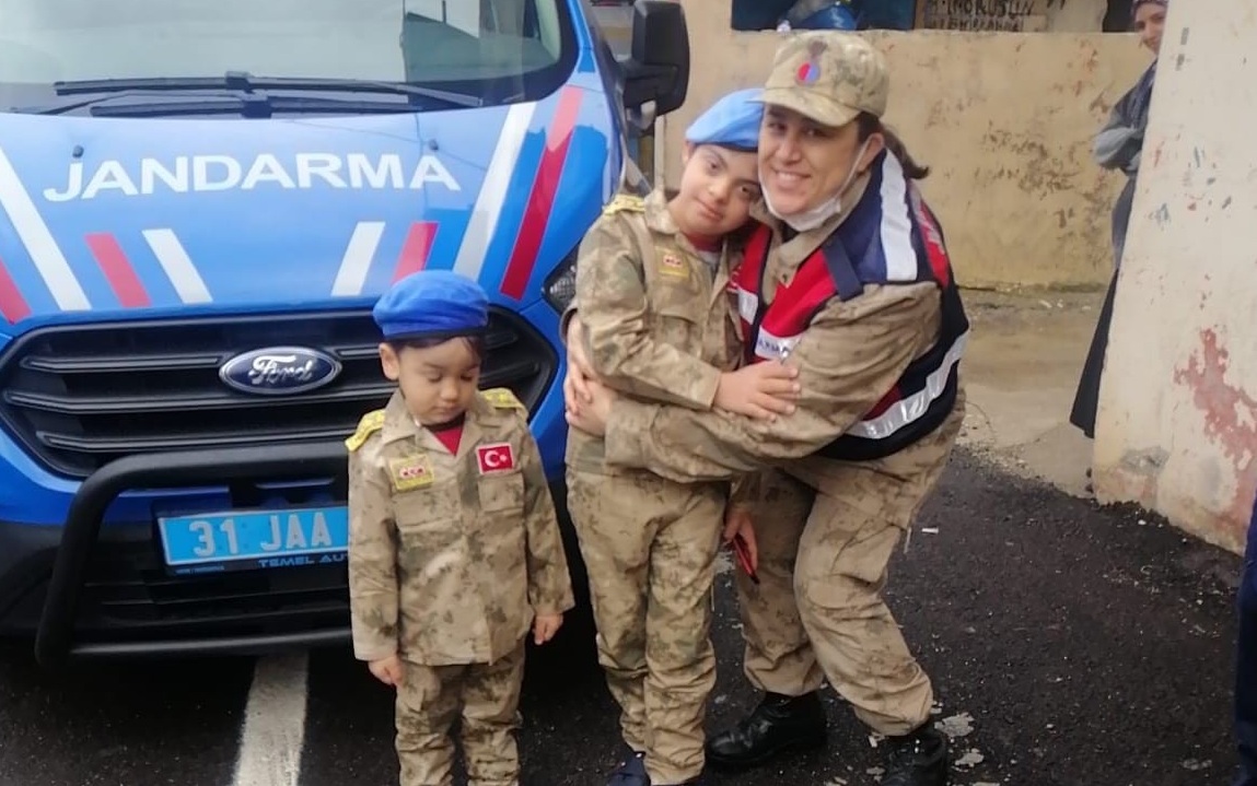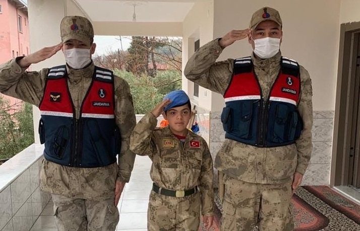 İskenderun İlçe Jandarma Komutanlığına bağlı ekipler, Cırtıman Mahallesinde ikamet eden Down sendromlu A. E. Y. isimli çocuğu evinde ziyaret ederek Jandarma üniforması ve bayrak hediye etti.