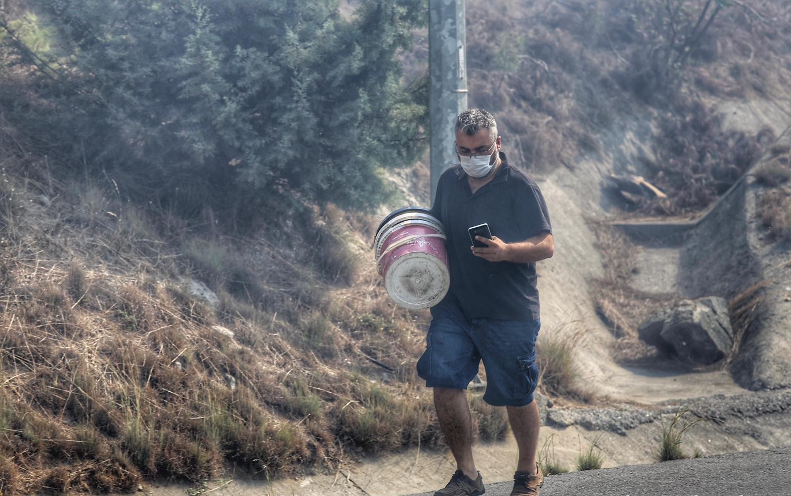 HATAY’DA YAŞANAN ORMAN YANGININDA, ELİNDE KOVALARLA ALEVLERE MÜDAHALE ETMEK İÇİN KOŞARKEN GÖRÜNTÜLENEN SÜLEYMAN IŞILDAR, “BİRÇOK İNSAN ASLINDA AYNI MÜCADELEYİ VERDİ. BEN ÖRNEK OLARAK DENK GELDİM KAMERALARA” DEDİ. (AHMET SEHER/HATAY-İHA)
