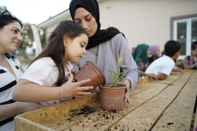 Üretim seralarında saksılara hazırlanmış toprakları yerleştiren minikler, atölye sonunda gazanya fidesini ekerek bakımlarını üstlenmek üzere evlerine götürdü.