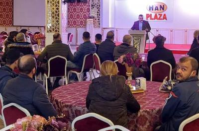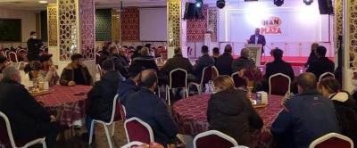 Milliyetçi Hareket Partisi Antakya İlçe Başkanı Mehmet Kanlı, bir salonda vatandaşlarla buluştu.