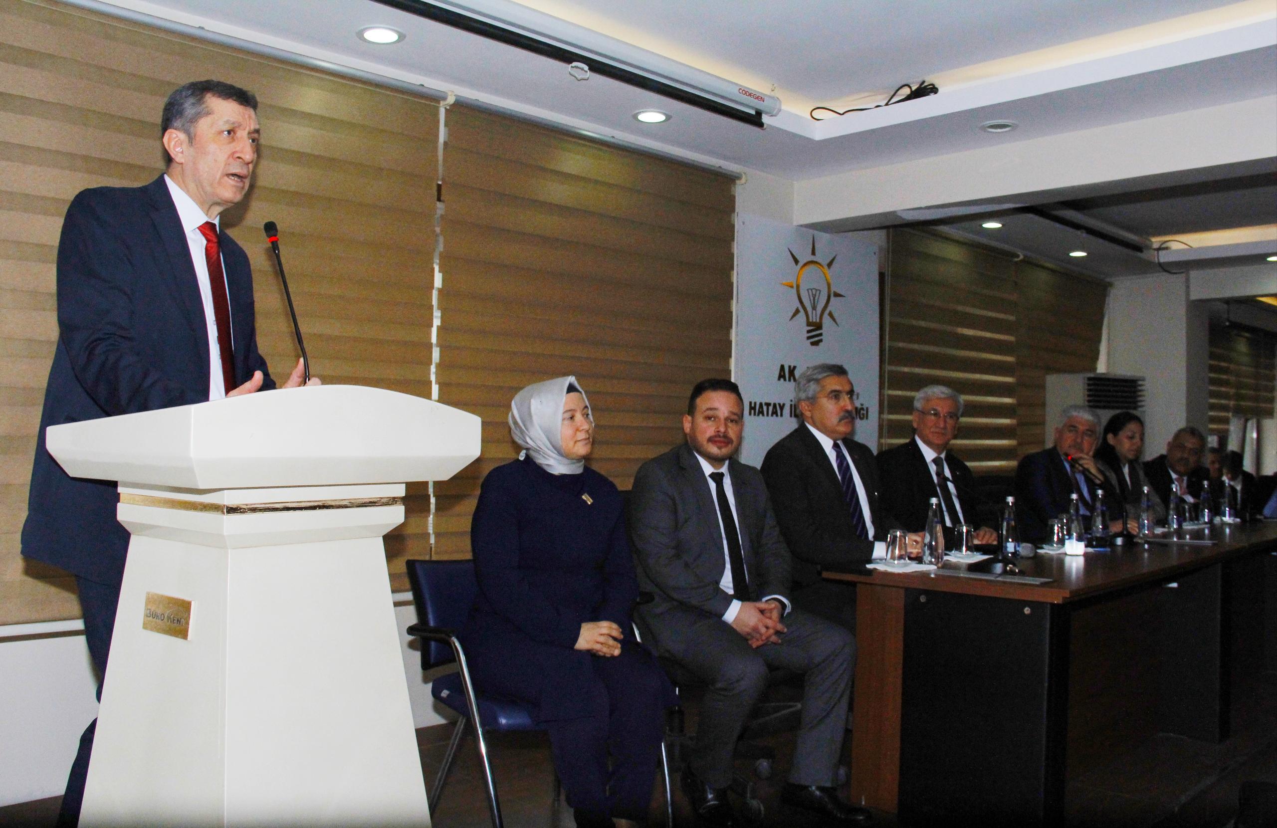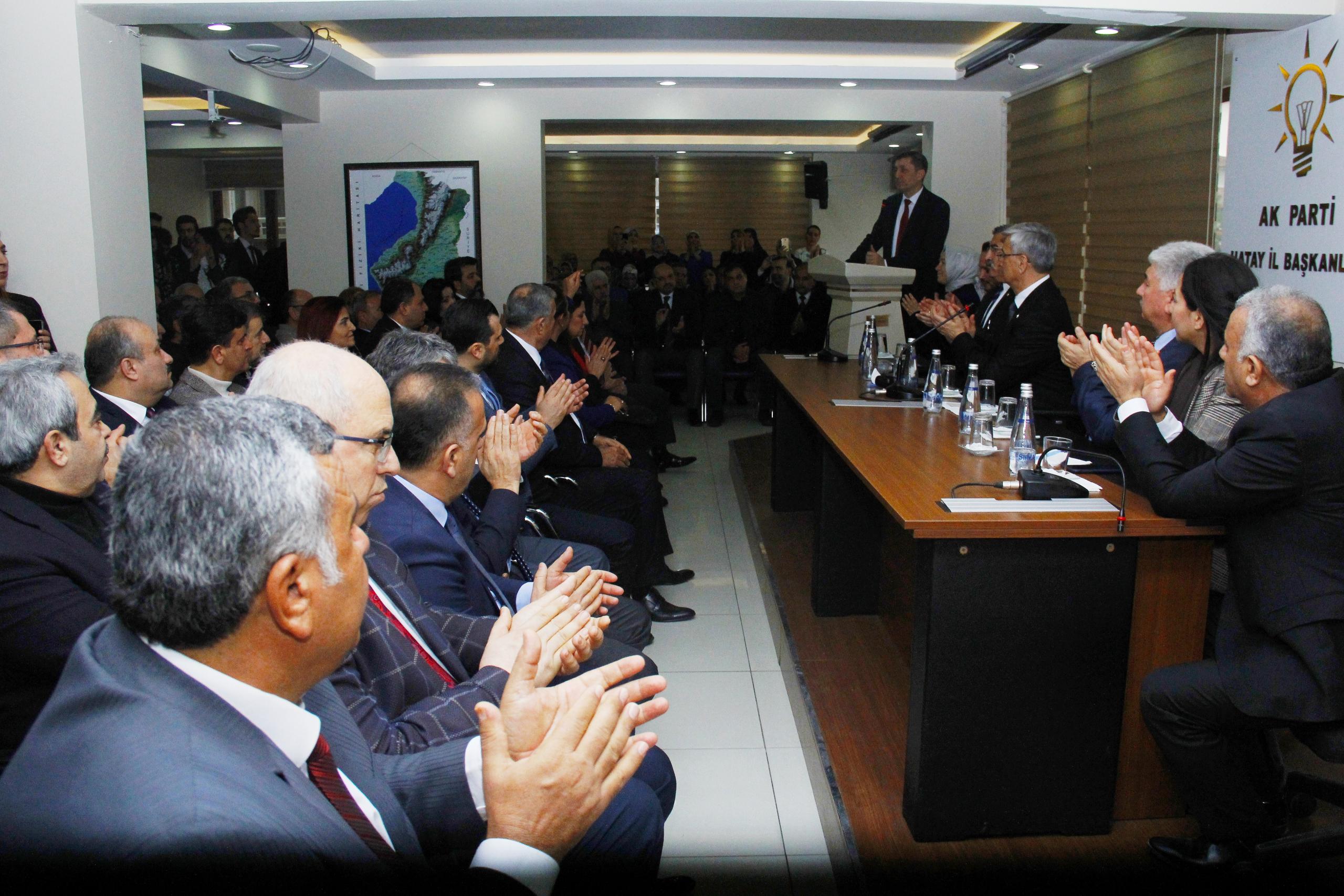 Daha sonra konuşan AK Parti Hatay İl Başkanı Mehmet Yeloğlu; “Bakanımızı ilimizde ve parti il binamızda ağırlamaktan mutluluğumu ifade ediyorum. Biz Milli Eğitim Bakanlığı gibi çok önemli bir kuruluşumuzun başında siz değerli bakanımızı görmekten dolayı son derece memnunuz. Sayın Cumhurbaşkanımız ekmeği gerçek ekmekçiye vermiş. Sizlerin de dediği gibi ‘biz ortalamaya talip değiliz,en iyisine talibiz. Çünkü muasır medeniyetler seviyesinin üzerine çıkmak ancak bu şekilde olur.Geldiğiniz için tekrar teşekkür ederim,hoş geldiniz, sefalar getirdiniz.” Diye konuştu.