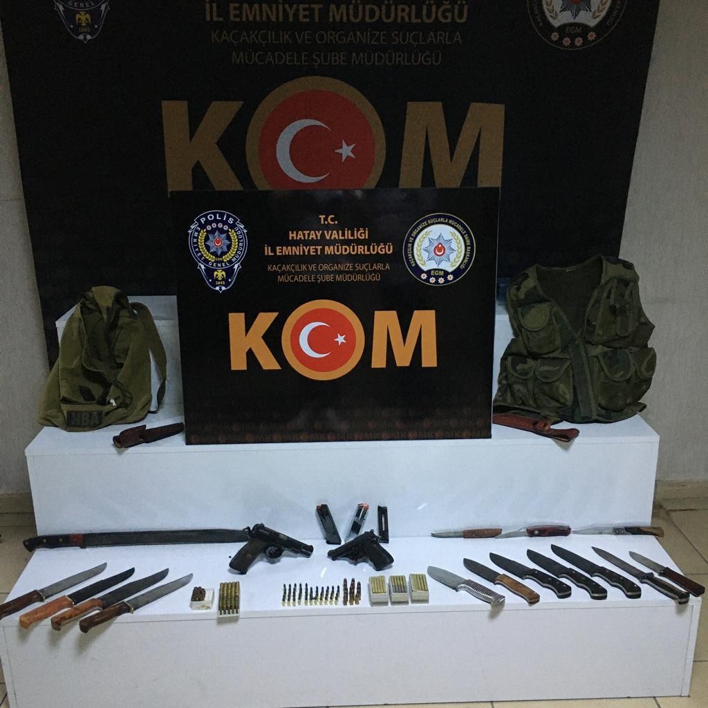 Hatay’ın merkez ilçesi Antakya’da polis ekipleri tarafından durdurulan bir motosiklet sürücüsünün çantasında yapılan aramada 2 tabanca ve çok sayıda bıçak ele geçirildi.