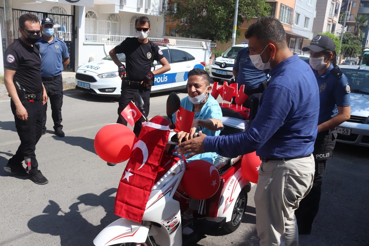 İskenderun ilçesinde yaşayan nörofibromatozis hastası 24 yaşındaki İhsan Kıbrıs’ın üç tekerli akülü motosiklet hayalini İskenderun İlçe Emniyet Müdürlüğü gerçekleştirdi. Sosyal medya hesabı üzerinden ‘keşke benim de üç tekerlekli motorum olsaydı?’ diye paylaşım yapan İhsan Kıbrıs’ın bu hayali üzerine harekete geçen İlçe Emniyet Müdürü Nevzat Güneş, emniyet bahçesinden ay-yıldızlı kırmızı-beyaz balon ve bayrakla süslenen akülü motosikleti İhsan Kıbrıs’ın evine gönderdi. Üç tekerlekli akülü motosikleti karşısında gören Kıbrıs, mutluluğunu gizleyemezken, İlçe Emniyet Müdürü Güneş’e ve polislere teşekkür etti. Daha sonra üç tekerlekli motosikletin teslimatının ardından İhsan Kıbrıs, polisler ile birlikte mahallede tur attı.