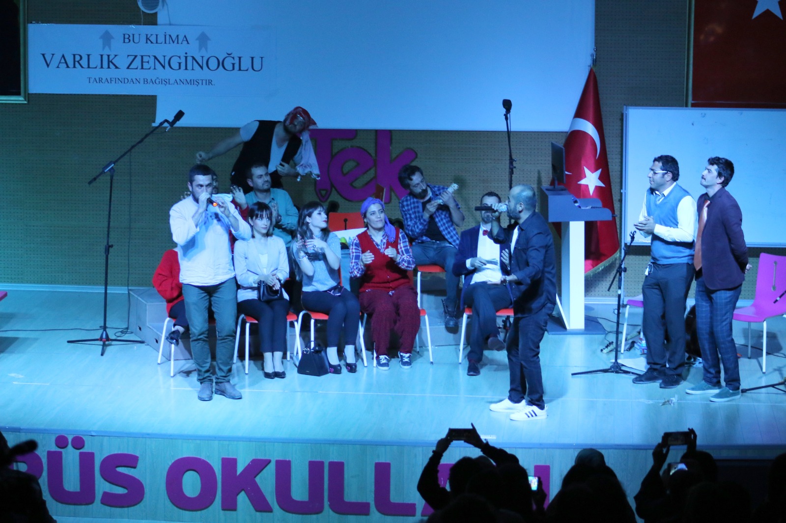 Arsuz İlçe Milli Eğitim Müdürlüğü’ne bağlı öğretmenlerden oluşan tiyatro grubu, TEK Kampüs Okulları’nda gerçekleştirilen “Ahval-i Tedrisat” adlı gösteriyle izleyenleri büyüledi. Arsuz Kaymakamı Musa Sarı, Hatay İl Milli Eğitim Müdürü Kemal Karahan, Arsuz İlçe Emniyet Müdürü Halil Karabacak, Arsuz İlçe Milli Eğitim Müdürü Ramazan Dönmez, Belen İlçe Milli Eğitim Müdürü Erdal Ayvazoğlu, Arsuz Belediye Başkan vekili Faik Çekin, şube müdürleri, TEK Kampüs Okulları Kurucusu Yılmaz Tunç, öğretmenler ve çok sayıda davetlinin katıldığı tiyatro gösterisinde öğrenci velileri, öğretmenler ve şube müdürleri arasındaki trajikomik olaylar konu edildi. Emekli olan öğretmenlere hizmet belgeleri, protokol üyeleri tarafından verildi. Program sonunda söz alan Arsuz İlçe Milli Eğitim Müdürü Ramazan Dönmez, gösteride emeği geçenlere ve tüm izleyenlere teşekkür ederek destek verenlere de çiçek takdim etti.