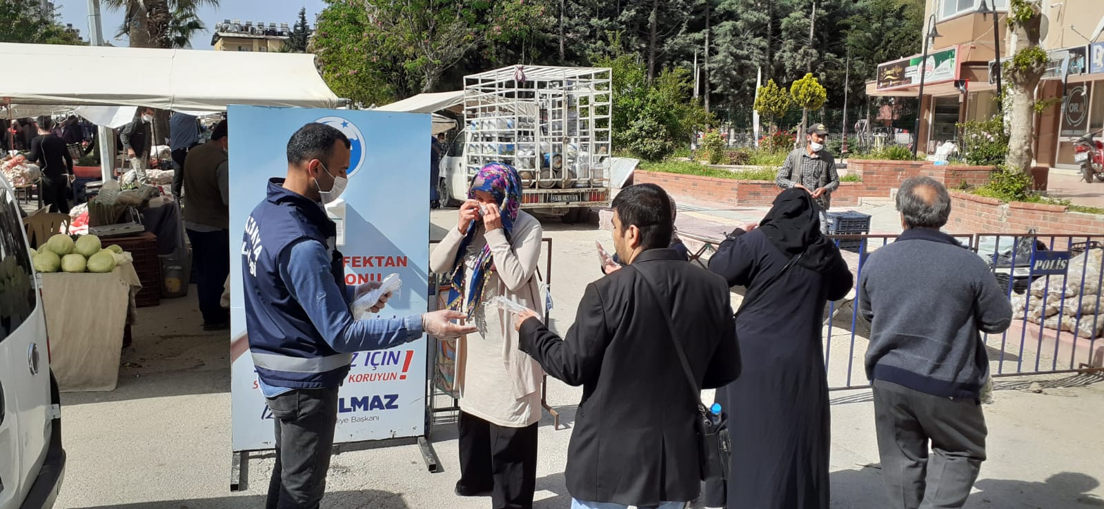 Koronavirüs ile mücadele tedbirleri kapsamında pazar girişlerinde kurduğumuz dezenfektan standımız ile vatandaşlarımızın ellerini dezenfekte etmesini sağlıyoruz. Ekiplerimiz semt pazarlarında pazarcı esnafına ve vatandaşlara maske dağıtımına da devam ediyo