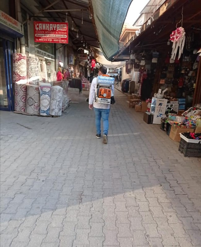 Antakya Belediyesi ekipleri, Koronavirüs ile mücadele tedbirleri kapsamında şehrin dört bir yanında dezenfekte çalışmalarını aralıksız sürdürüyor.