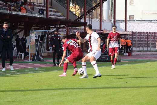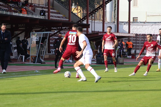 SÜPER LİG’İN 12. HAFTA MAÇINDA ATAKAŞ HATAYSPOR, SAHASINDA FATİH KARAGÜMRÜK İLE KARŞILAŞIYOR. MAÇIN İLK YARISI EV SAHİBİ EKİBİN 1-0’LIK ÜSTÜNLÜĞÜ İLE TAMAMLADI. (ADEM KARAGÖZ/HATAY-İHA)