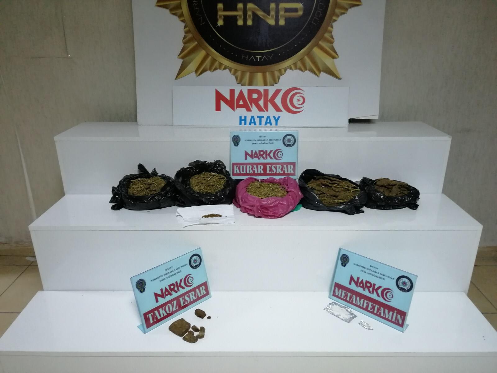 ALTINÖZÜ İLÇESİNDE 2 KİLO 468 GRAM GRAM KUBAR ESRAR, 6,20 GRAM METAMFETAMİN, 99,40 GRAM TAKOZ ESRAR MADDESİ ELE GEÇİRİLDİ. (GÖKHAN AKLAN/HATAY-İHA)