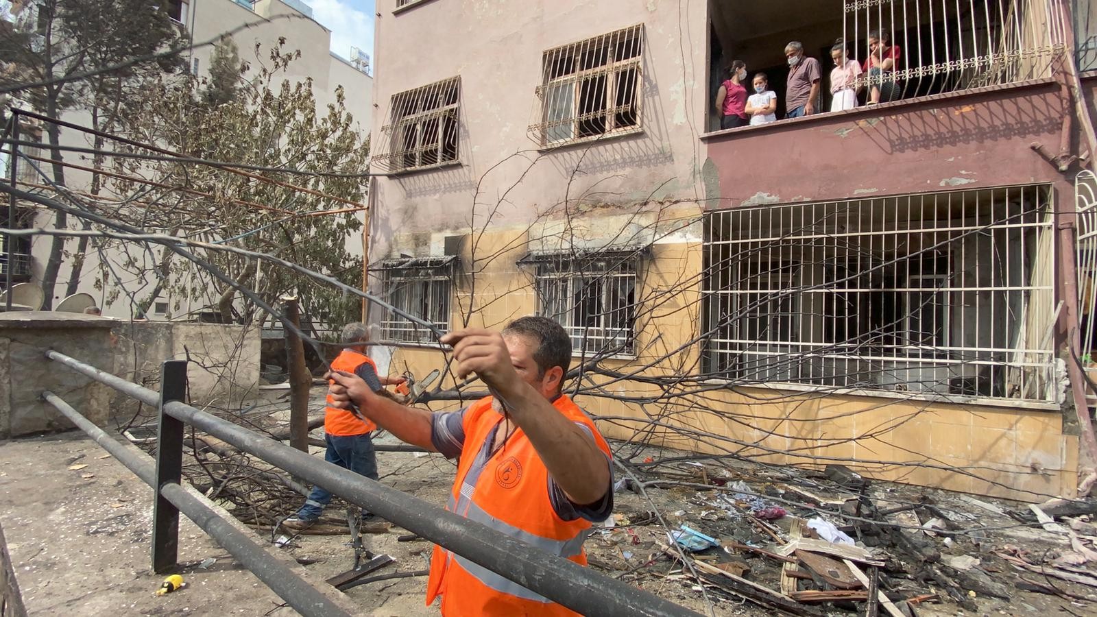 Yanan evden geriye kalanların belediye ekipleri tarafından traktöre yüklenerek götürülmesi ise evin balkonundakiler tarafından hüzünlü bakışlarla izlendi.